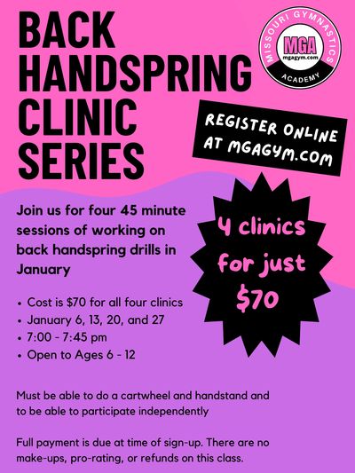Spend an hour working on your back handspring and the fundamentals that help you perfect it! This clinic is open to children ages 6-12 and costs $25.