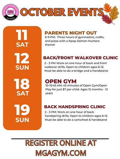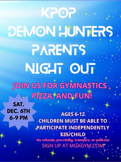Enjoy three hours of gymnastics, pizza, and fun activities on our themed Parents Night Out events!